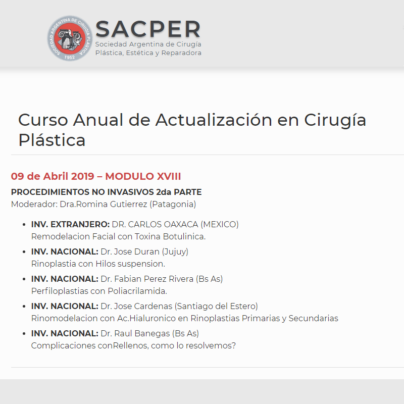 El Dr Pérez Rivera presentó algunos de sus resultados de rinomodelación y perfiloplastía con relleno permanente en el marco de la disertación en el Módulo de Procedimientos No Invasivos del Curso de Actualización en Cirugía Plástica de SACPER, 9 de abril de 2019.