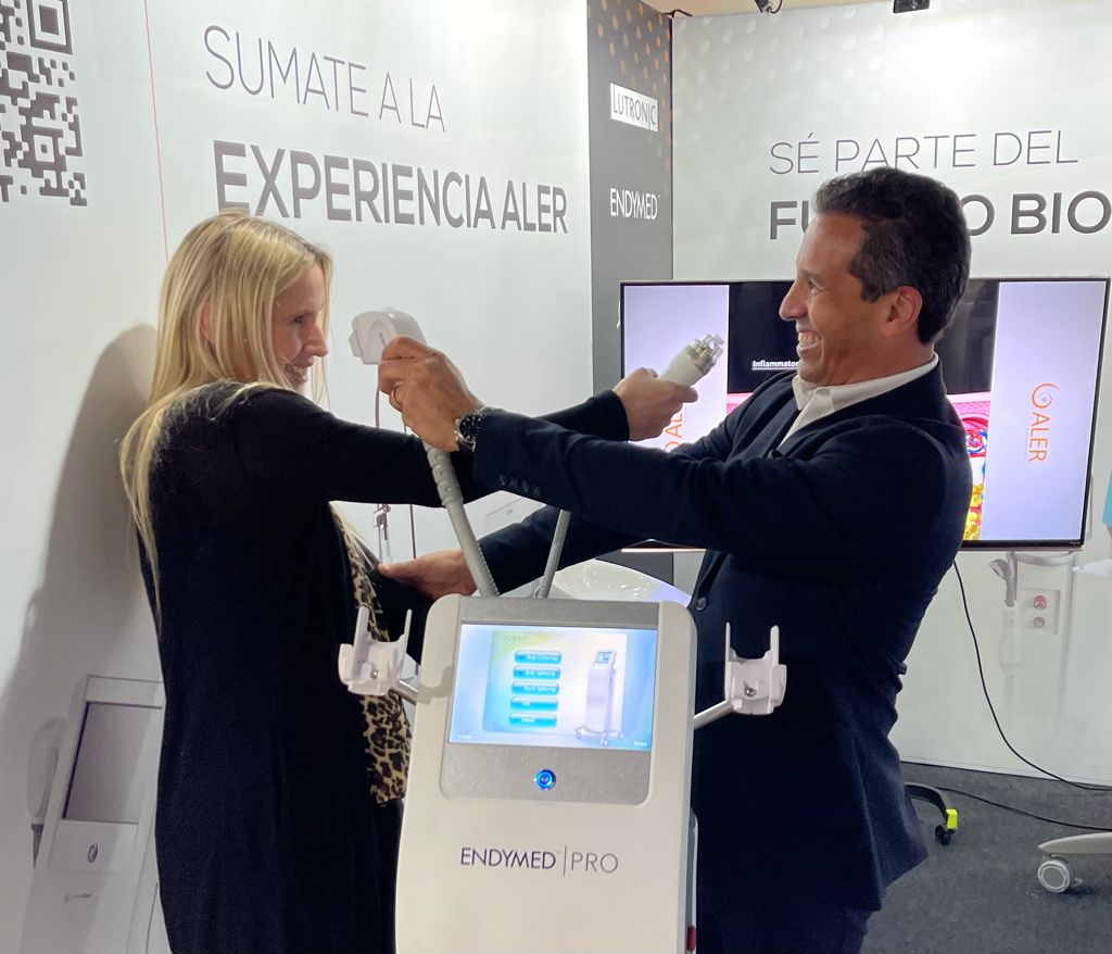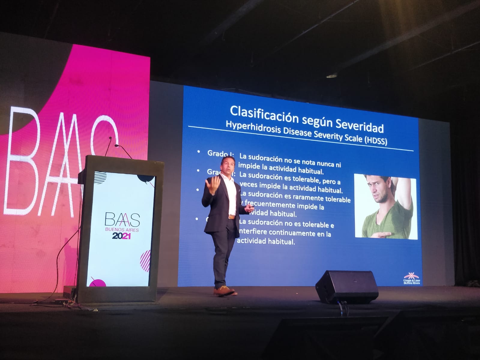 El Dr. Perez Rivera compartió su experiencia sobre "Tratamiento de la hiperhidrosis y bromhidrosis axilar mediante radiofrecuencia por microagujas y a través de láser y legrado" en un auditorio de colegas y visitó los stands de la muestra.